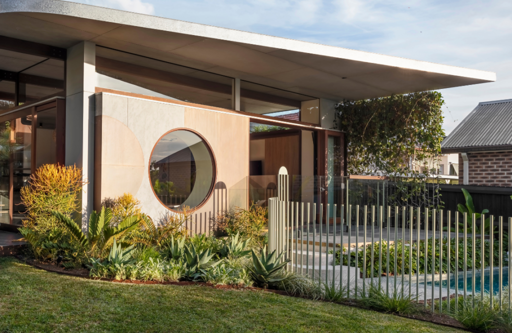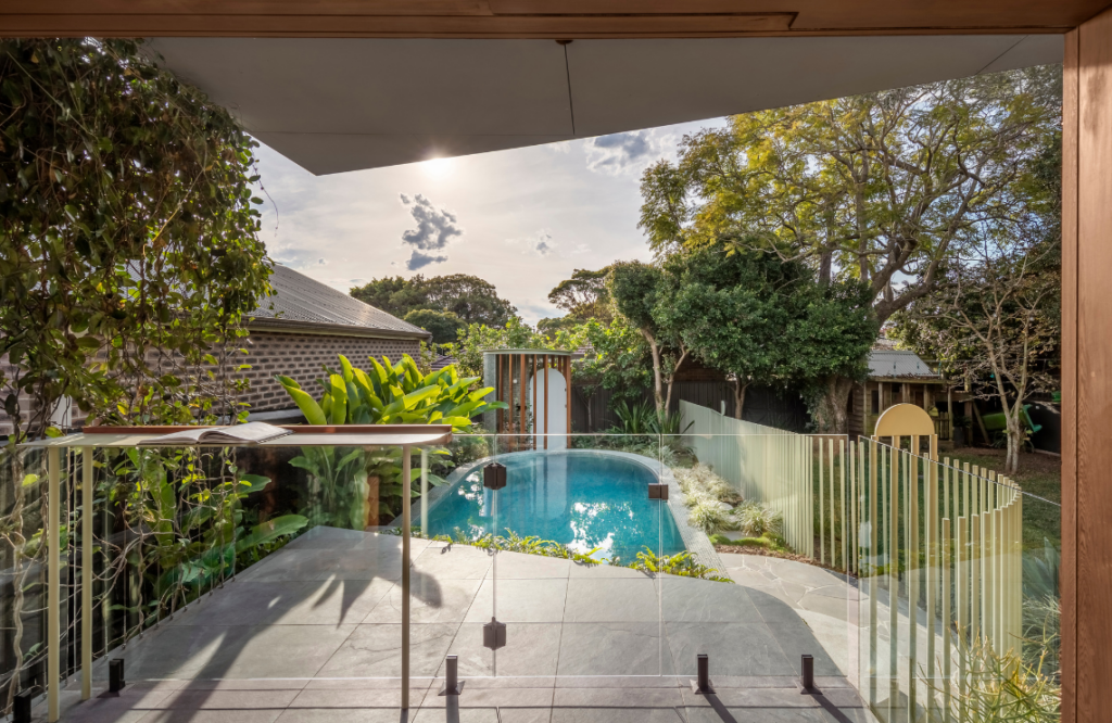 Ryan says the design transcended these constraints through small interventions and circular language that weaves together the old and the new. “Half-circle steps and a bar table seamlessly bind the pool to Totoro House, while an arch feature resolves problematic stepping transitions, anchors the pool’s entry, and doubles as a future lamp holder,” he explains.