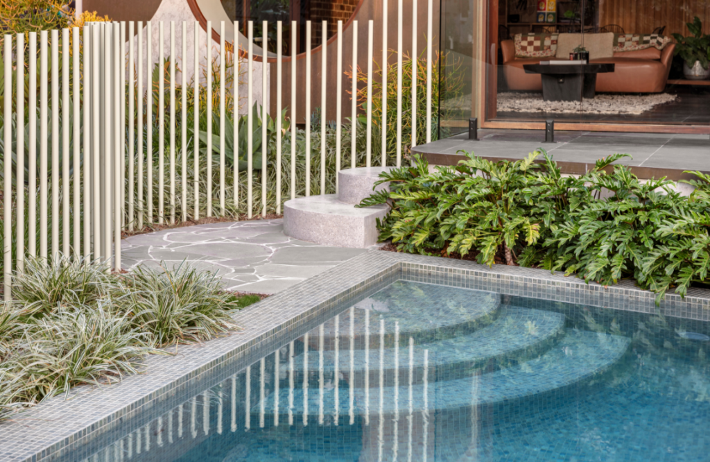 Poolside is the perfect location to sip a long cool drink and watch the world go by. It’s a quiet and relaxing space, the silence broken only by the sounds of the kids’ laughter as they splash about in the pool. Level changes, including a step-down solution for the pool fence from the existing elevated sun deck, were cleverly overcome.