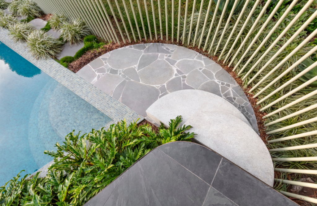 Organic sweeping curves offer a very real sense of connectedness to nature. Stepping down from the sundeck there are exposed aggregate concrete steps that add texture, playful bluestone crazy paving, and pool steps. The project artfully integrates built and natural environments — one blends effortlessly with the other. The green Bali-inspired tiles add a relaxed tropical vibe.