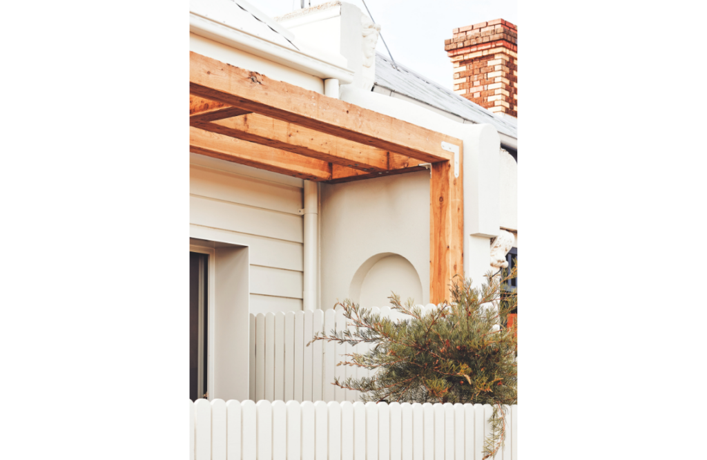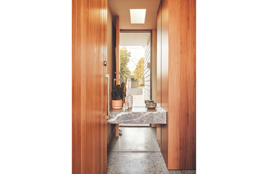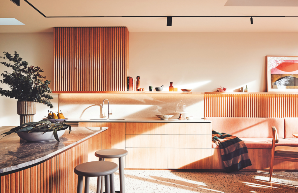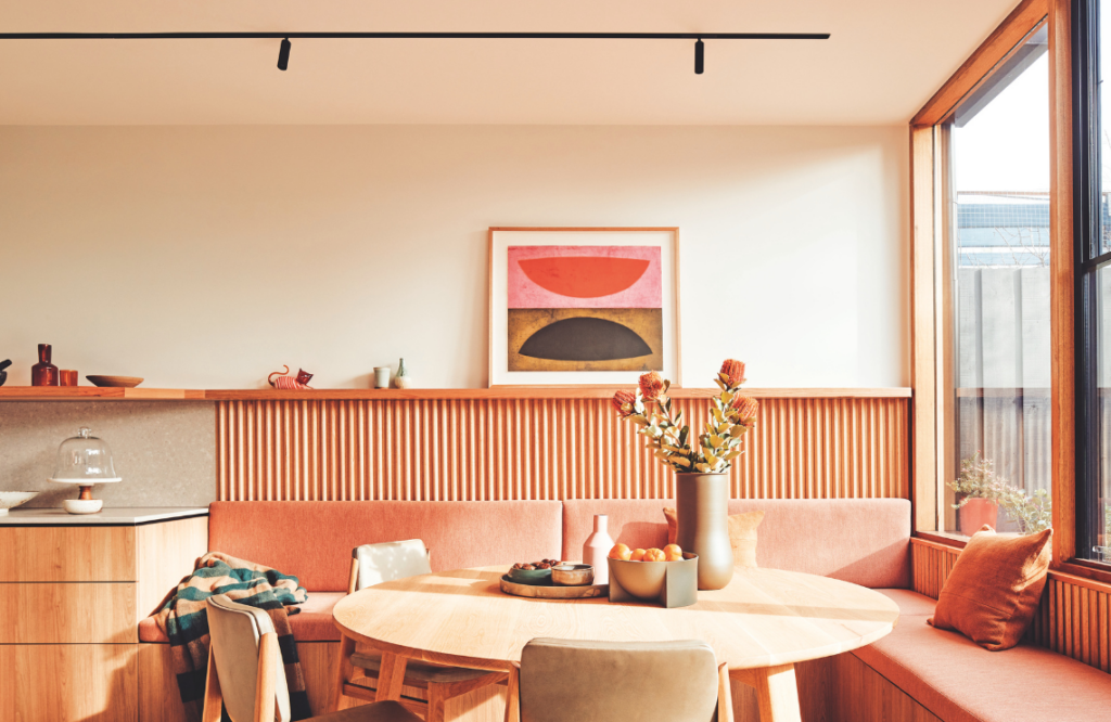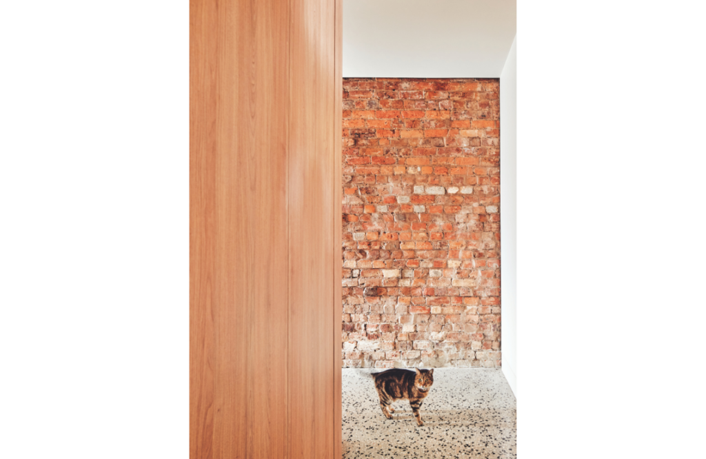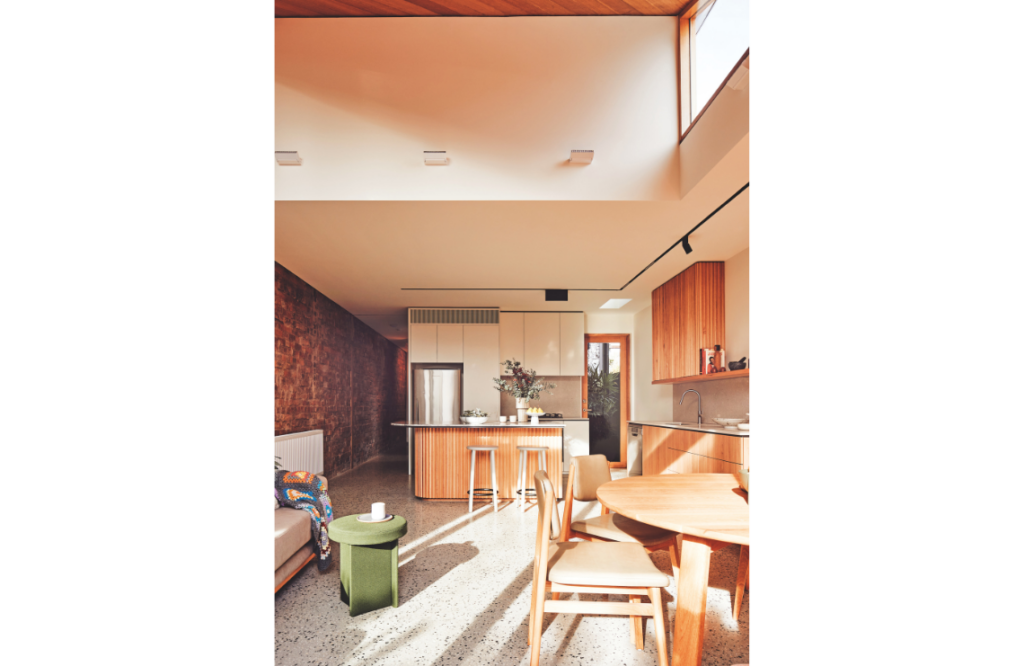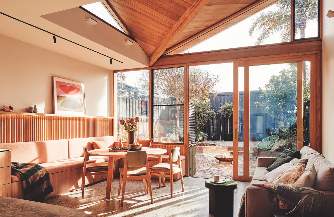 Sally points out that the colours of the house, both externally and internally, are based on the native Australian bush. “The green externally, the Tasmanian timber with its pink hues and the fabric on the banquette were carefully chosen to complement the existing heritage brick dividing wall that was retained and remains exposed,” says Sally.