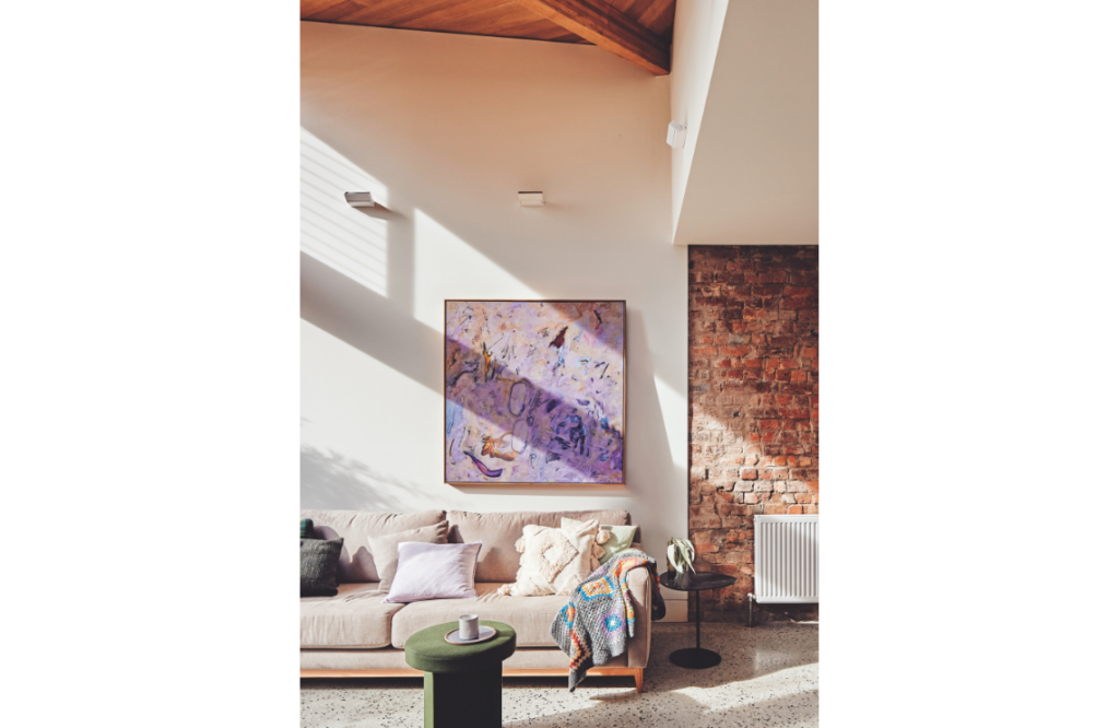Built as a “forever family home”, the interior material and colour palette is “neutral and earthy”. Textures such as Tasmanian oak and natural stone complement the exposed brickwork that was preserved from the original building. A muted colour palette of greys and soft pinks creates a feeling of warmth with an intricate stained-glass window in the stairway, reminiscent of a “droopy gum tree with its myriad greens and pinks and yellow hues that are highlighted when the sun shines through it”.