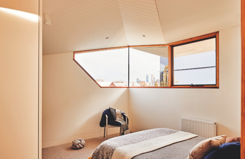 “The client also knew from getting up onto the roof that there was a view to the city, so we designed the large corner window to frame the view in the main bedroom,” says Sally Timmins, director of Timmins+Whyte Architecture+Design. “The clients have already sent us photos of the window from their bed showing three hot-air balloons passing by early one morning, and another of the city glowing as the sun was setting in oranges and pinks.”