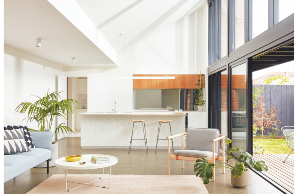 Both Bardolph Garden dwellings achieve a minimum of 8 NATHERS stars. “With passive design in mind, the dwellings incorporate plenty of thermal mass, prioritising winter solar heat gains, sun shading and cross-ventilation. Rainwater is collected and stored on site and plumbed back into toilets and garden taps for re-use,” says Breathe Architecture.