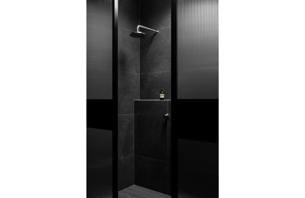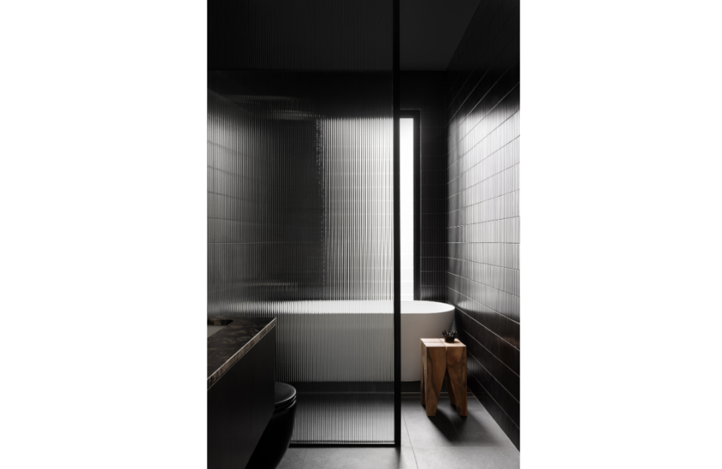 Fluted glass creates an interesting textured look, it complements the darkwall tiles