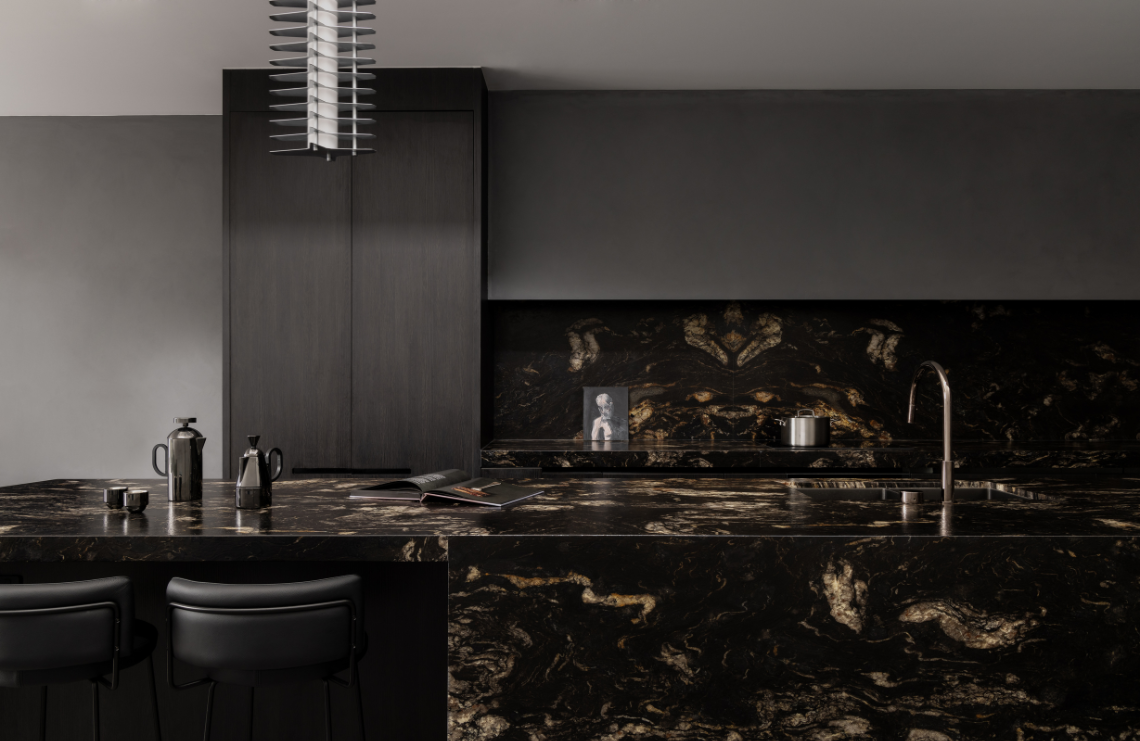 A handsome colour palette with unique stone handpicked as the island and Splashback is the hero in the kitchen