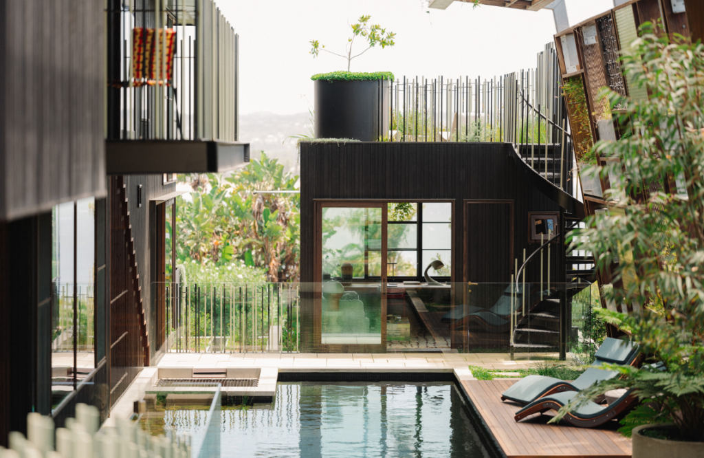 “In their off-grid sanctuary, they can grow their own food, read a book in a hammock, and supervise their kids from all living spaces around the low-maintenance natural freshwater swimming pool — plus go cycling or surfing whenever they want,” enthuses Clinton.