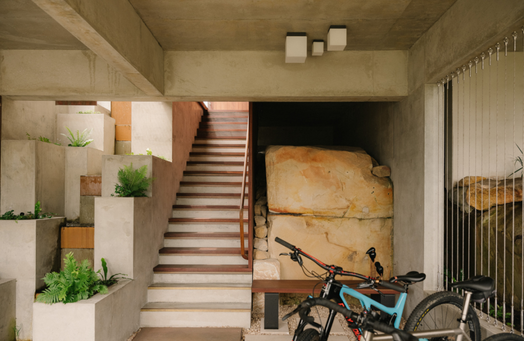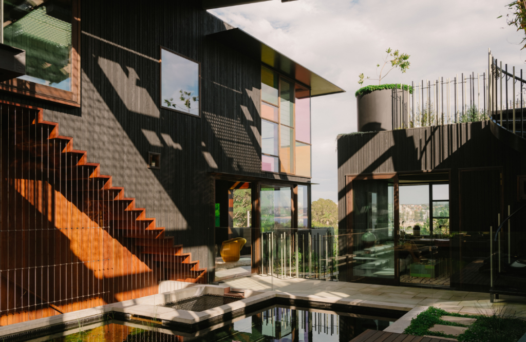 The home comprises four bedrooms, three-and-a-half bathrooms, a home office, a kitchen, a living room, dining, and an art room. There’s also a rooftop garden, vegetable garden, chicken coup, reading area and outdoor dining space. The natural swimming pool is a leafy oasis of calm; close your eyes for a moment and you can imagine you are in a cool rainforest. Clinton says the owners wanted a natural pool and this became the heart of the concept. “Water cascades from natural landforms at the rear of the home, running like a rainforest creek between dramatic living spaces and an expansive outdoor deck,” he says.