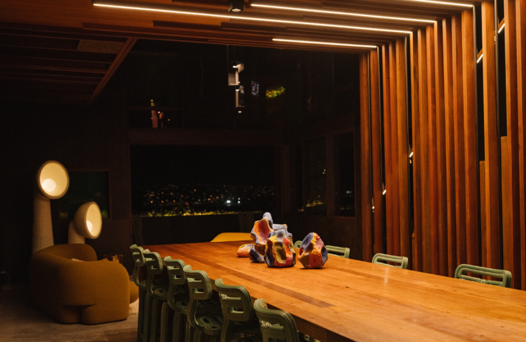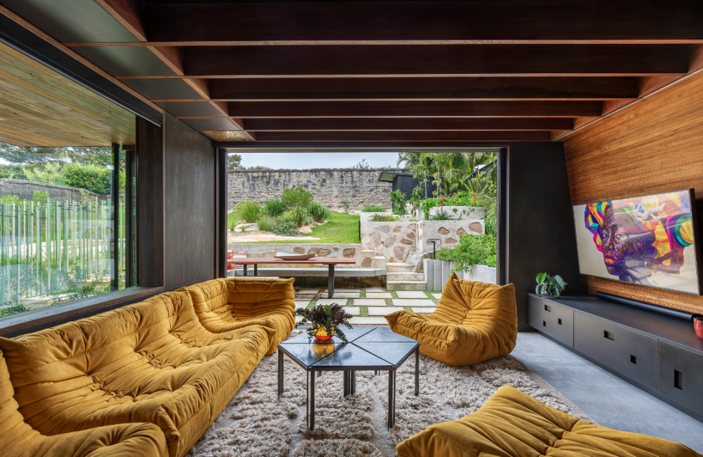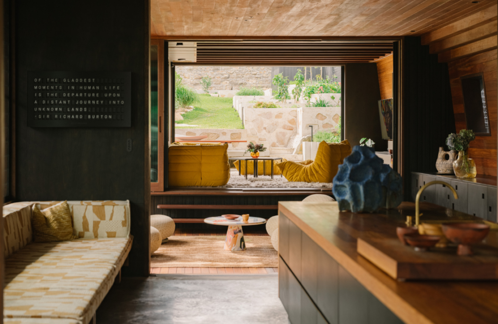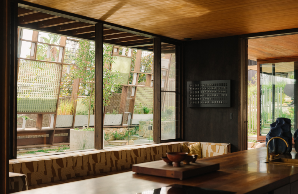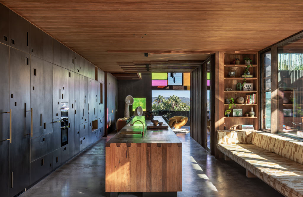 Indoor spaces are warm and welcoming, filled with sunshine and dappled light that plays on the coloured glass. The colour palette is a melody of dark timbers with metal accents. Furniture and decor in lighter, brighter hues lift the internal spaces.