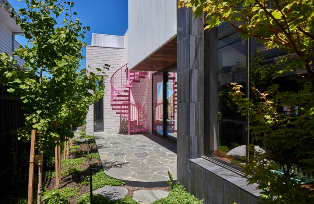 A pivotal moment for the architects was craning in the pink staircase. “On a cold and bleak Melbourne morning it was quite a spectacle to see a bright Barbie-pink staircase hoisted from the truck and lifted high over the street,” recalls Yvonne. “Several neighbours and onlookers congregated in the street to watch the pink staircase fly through the sky.”