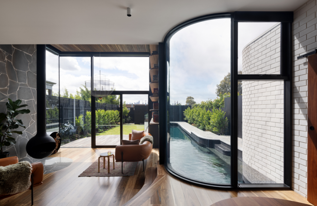 The swimming pool is one of the stars of the show in this project; it ends with a sweeping curve against the house. Yvonne says the client is an avid swimmer and it was important for the pool to be functional for daily swims and to visually connect to central living areas.