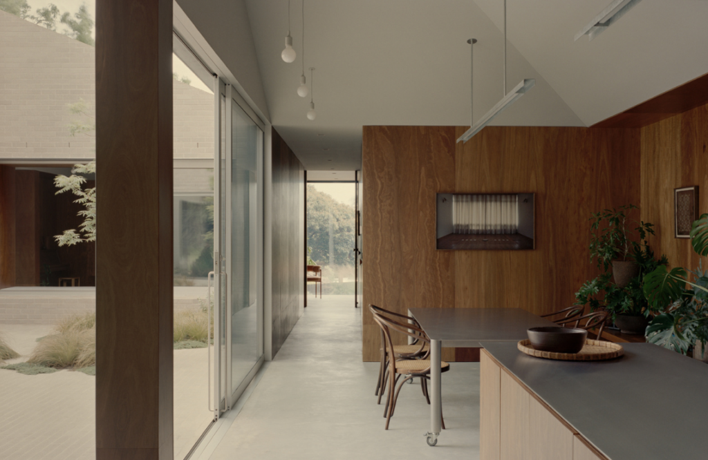 “The home wraps entirely around a central courtyard, and links a sequence of living rooms to their corresponding outdoor spaces like a chain” — Kim Bridgland and Aaron Roberts.