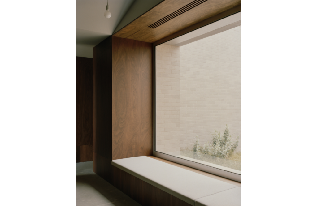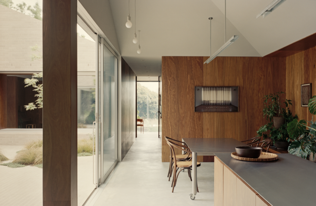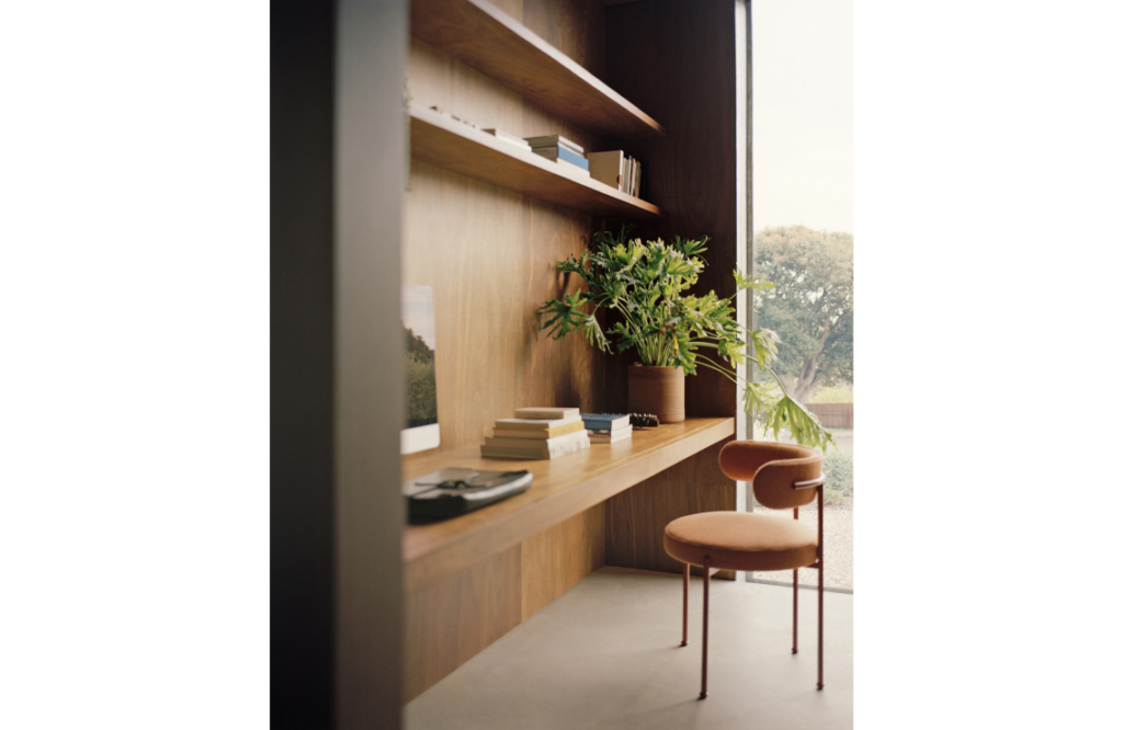 For Kim and Aaron, it isn’t just one built element or aspect of the design that makes it truly special. It’s the way the home feels. “There is always a deep sense of calm every time we step inside, like we have been taken on a journey and feel so emotionally and creatively rejuvenated after we visit,” they say. The home has a small footprint. The strong use of materiality supports a sustainability ethos and the bricks that clad the house were an eco-friendly choice. Walls and doors are lined in beautiful spotted gum plywood. The northern orientation captures warming sunlight, and burnished concrete floors off er thermal mass, creating warmth. Ample glazing offers opportunities for cooling breezes and air flow.