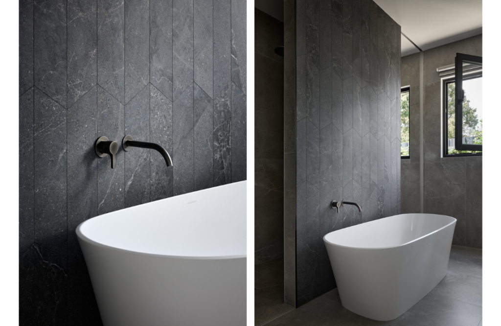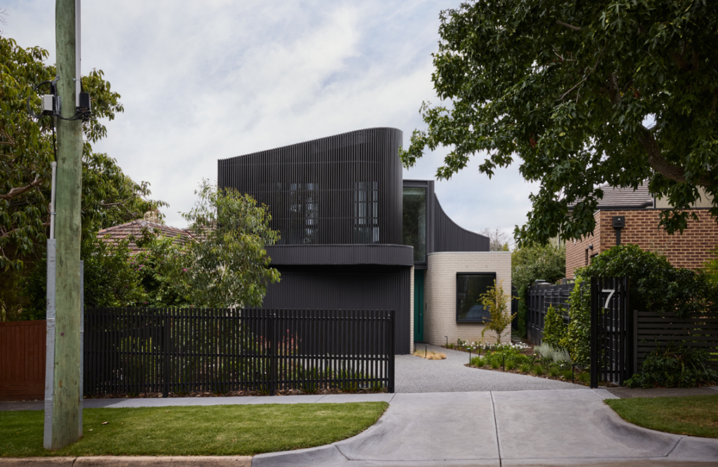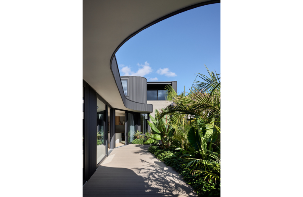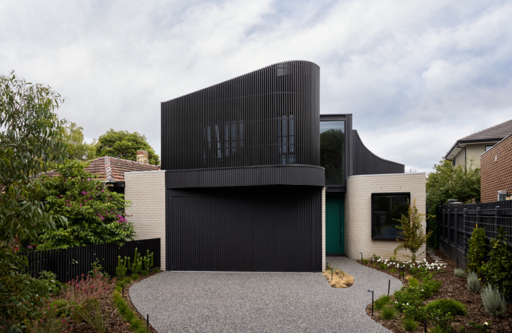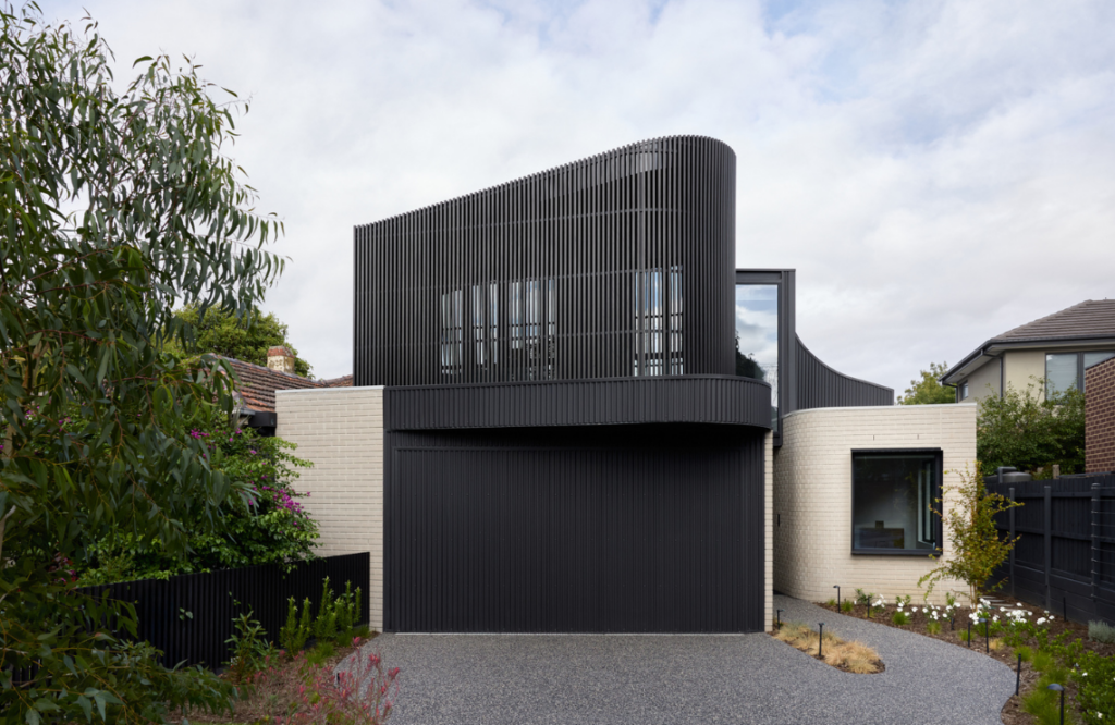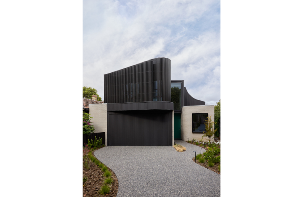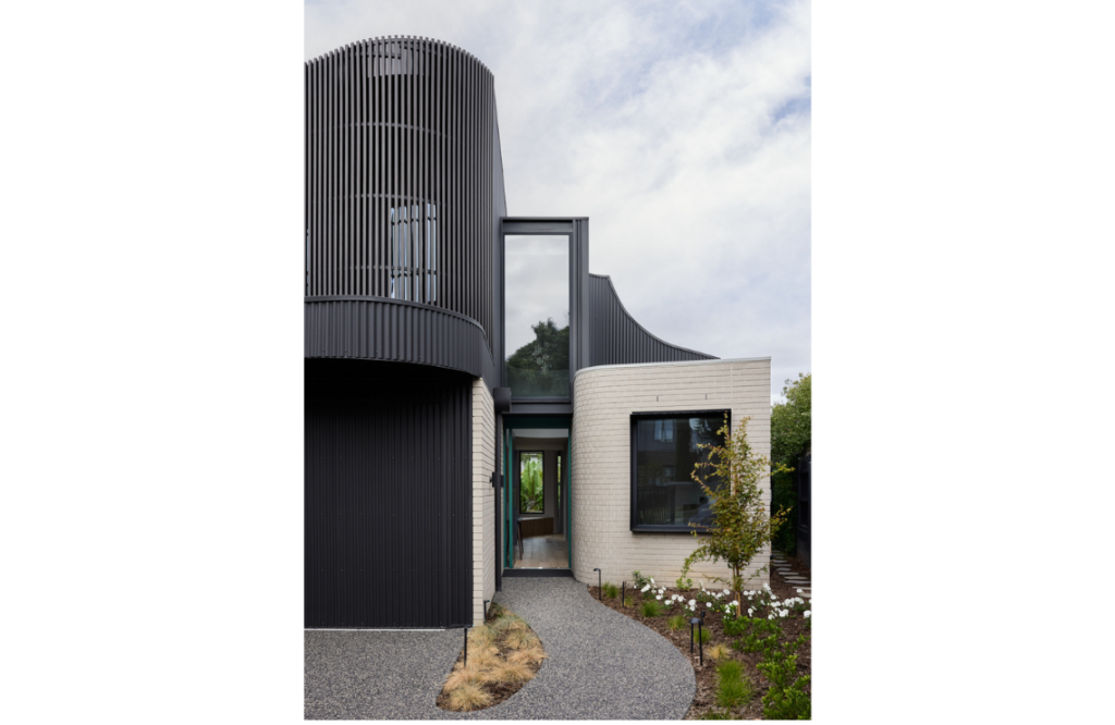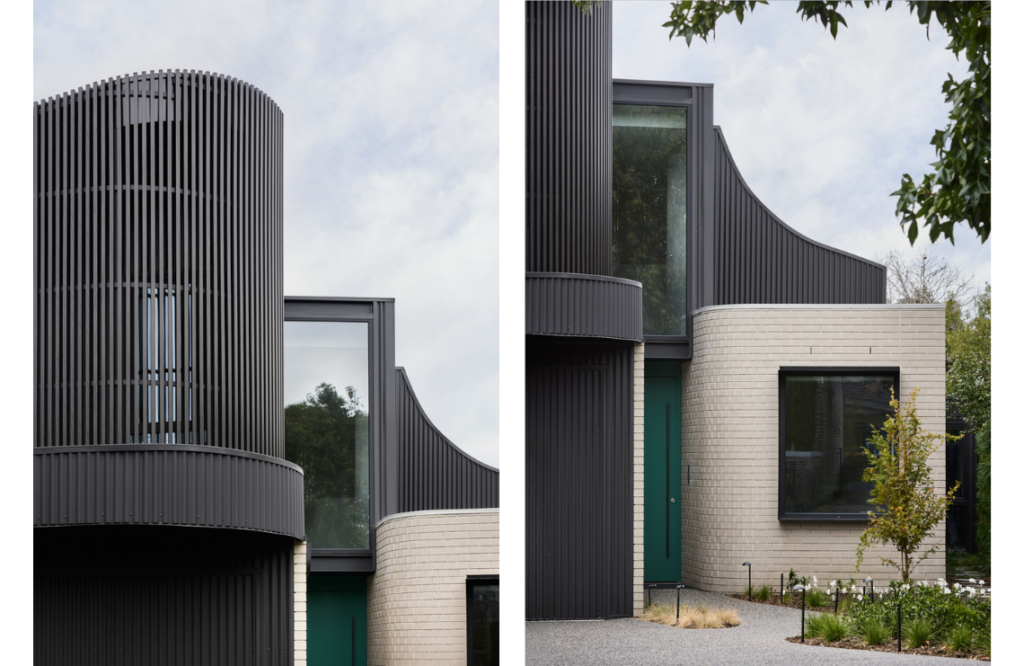 The exterior has a striking presence in its materiality and its modernism. It’s one of the areas where it dares to be different. “A rotated frontage engages with the approach rather than simply facing the street,” notes Aaron. This clever approach and arrival sequence is what defines its character. “As you move toward the house, the interplay between form and material immediately captures attention,” he says. “Dark vertical fins and rippled metal cladding wrap the upper level, creating a bold contrast with the light, grounded brick base.”