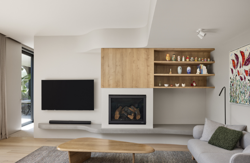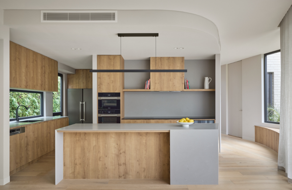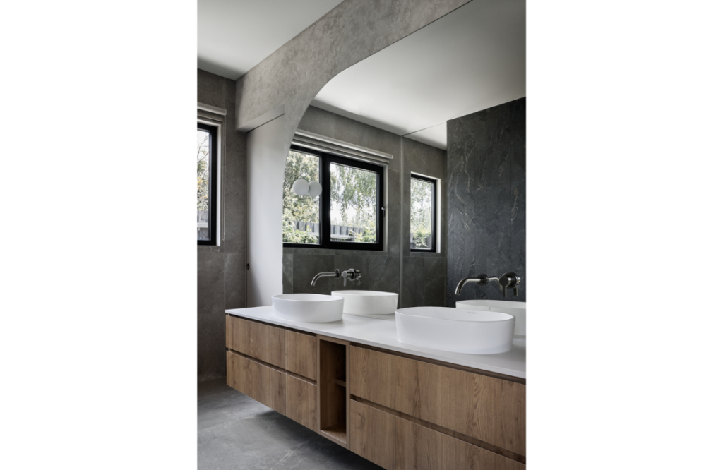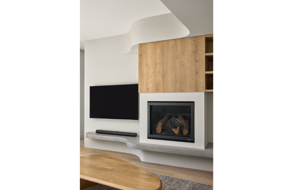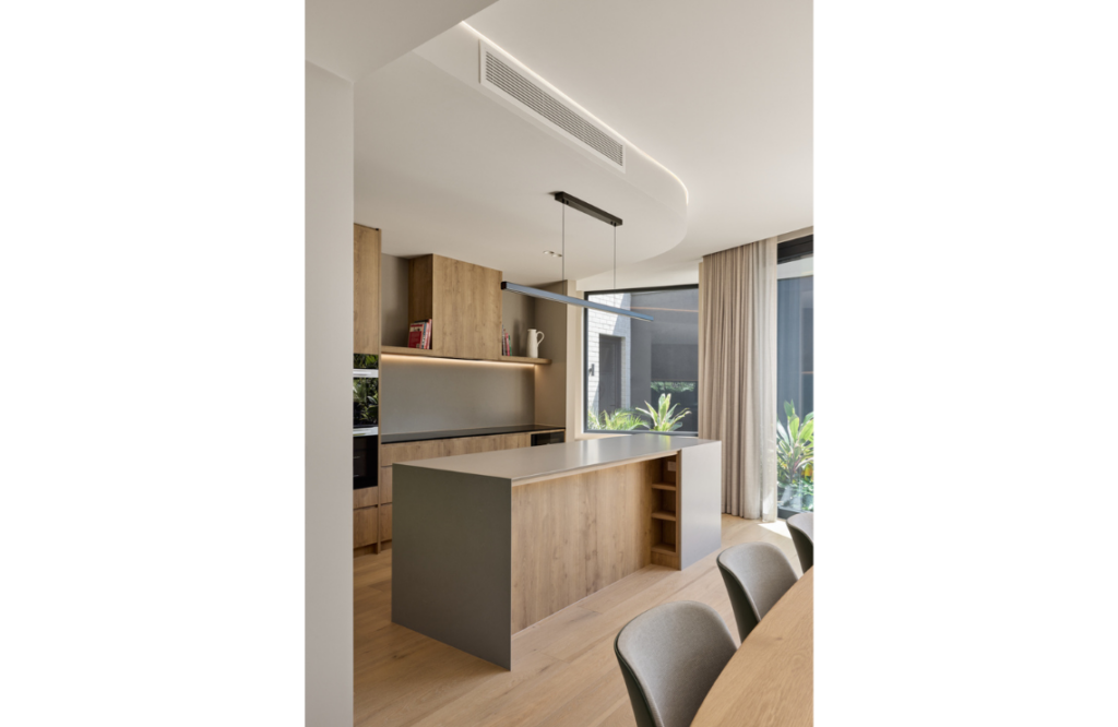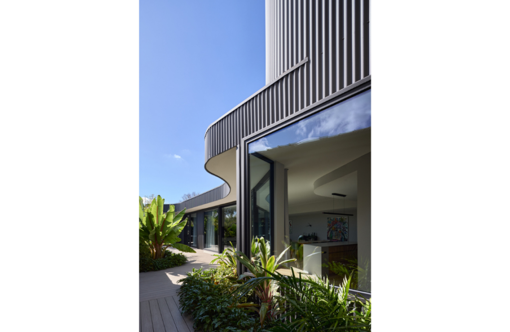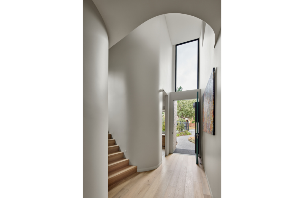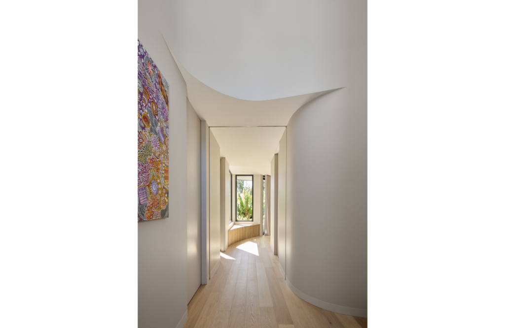 This forever home is a sculpted architectural achievement in inspired design and innovation. The fluid form of the building is referenced in the materiality, long-term living, and also how architecture can connect intrinsically to the natural world. “The home draws on the imagery of ripples in water, expressed through sculptural forms, curved walls, and flowing spatial transitions,” explains Aaron. “These soften edges and dissolve boundaries between inside and out.