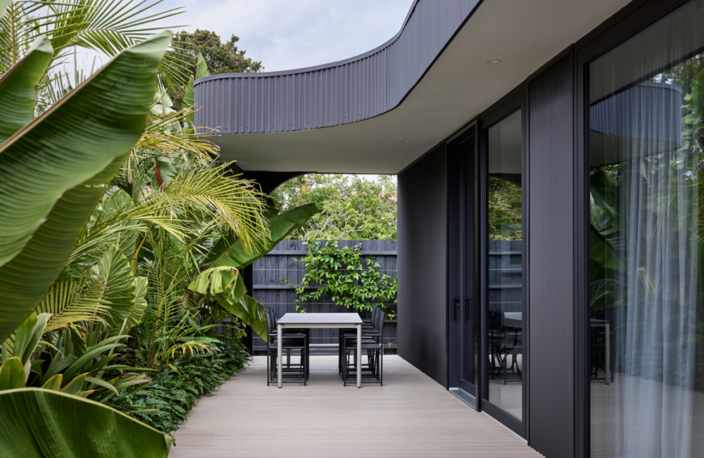 On the upper level, corrugated steel offers robust form and visual movement in the interplay of light and shadow as the sun tracks across the sky. Aluminium batten screening offers privacy. Sustainable design strategies include a north-facing courtyard, deep eaves where needed, minimal south-facing glazing, double-glazed UPVC systems and more.