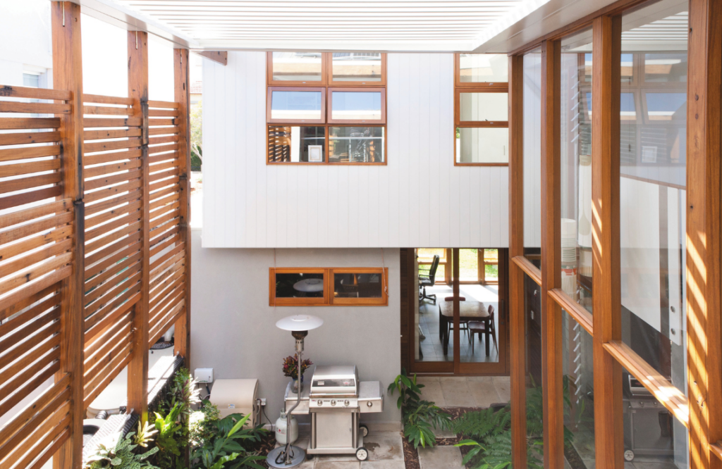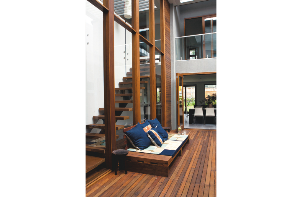 “The challenge was taking advantage of the northerly aspect. The north sun only hits the front of the house, so we developed the idea of an inner/outer courtyard within the structure, bringing natural light into the southern part of the house. This is the success of the house and why we can perform to an eight-star rating.” This central courtyard is not only a major contributor to the passively designed space, but also a lovely recreational area for the family to enjoy.