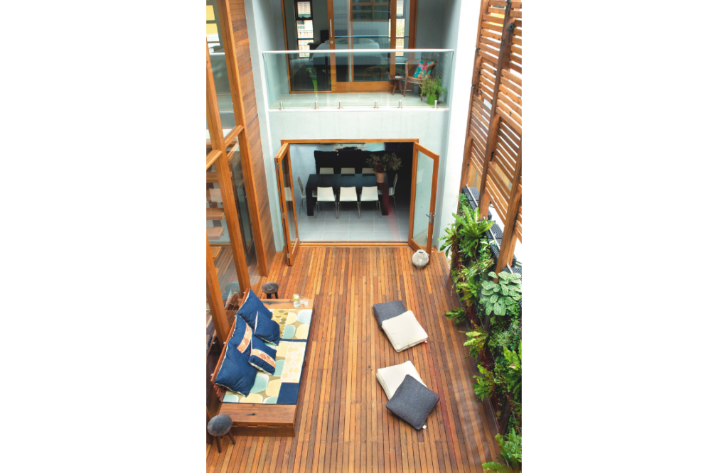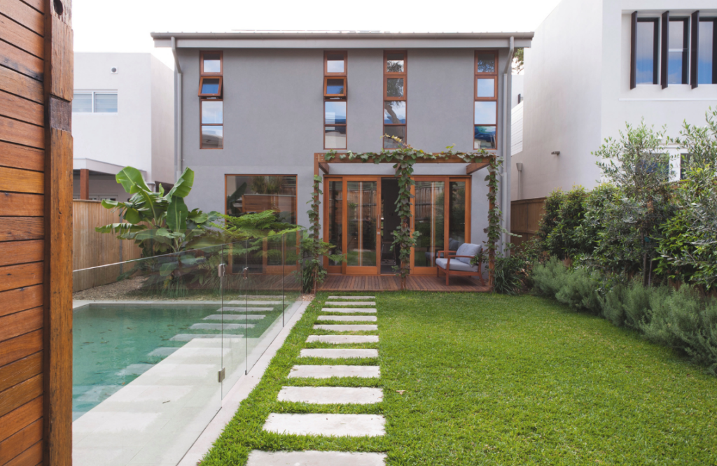 What came next was the design and construction of four adjoining sustainable homes, built and developed by Australian Living (a company founded by Cameron in 2008), with Cameron leading the team. “I came up with the concept of an eco challenge whereby every homeowner had their own architect and as a team, including myself, had to design a home as eco-friendly as possible — not only an energy-efficient dwelling but also one that minimised the carbon footprint,” he explains.