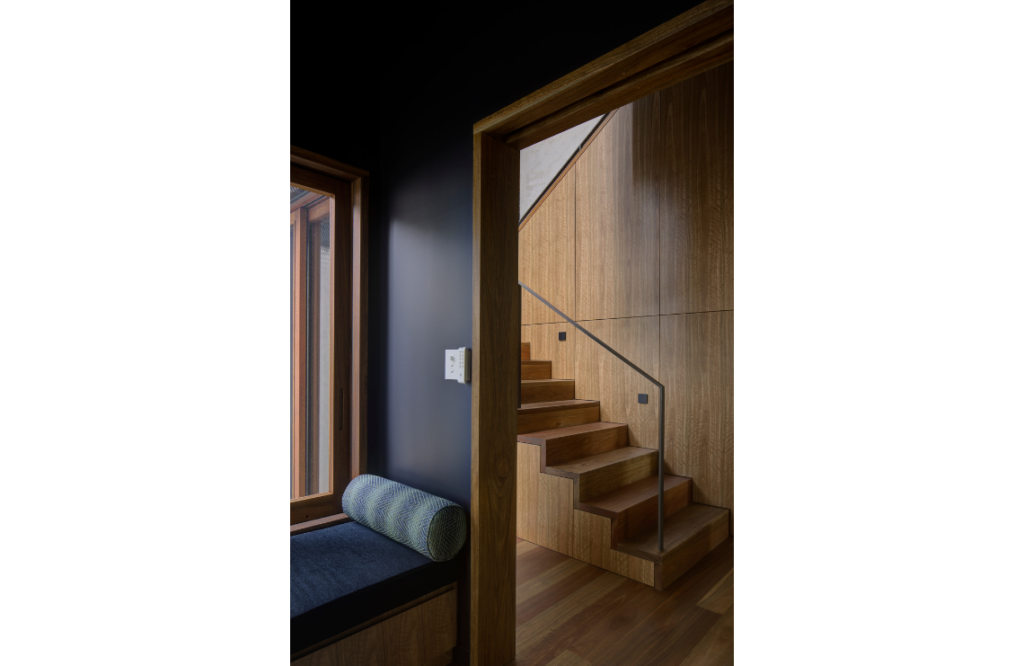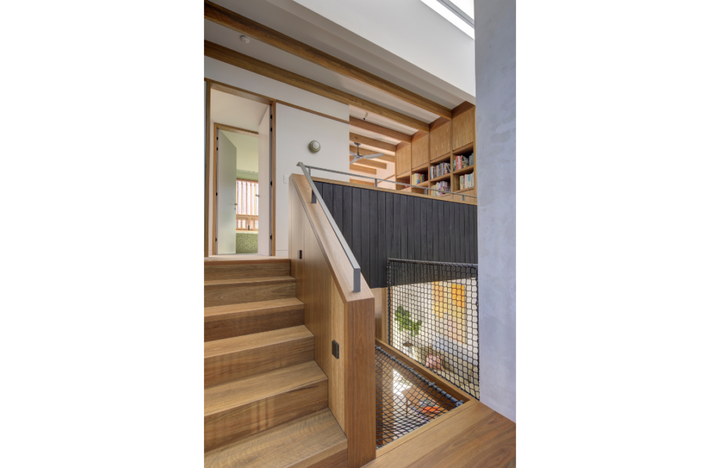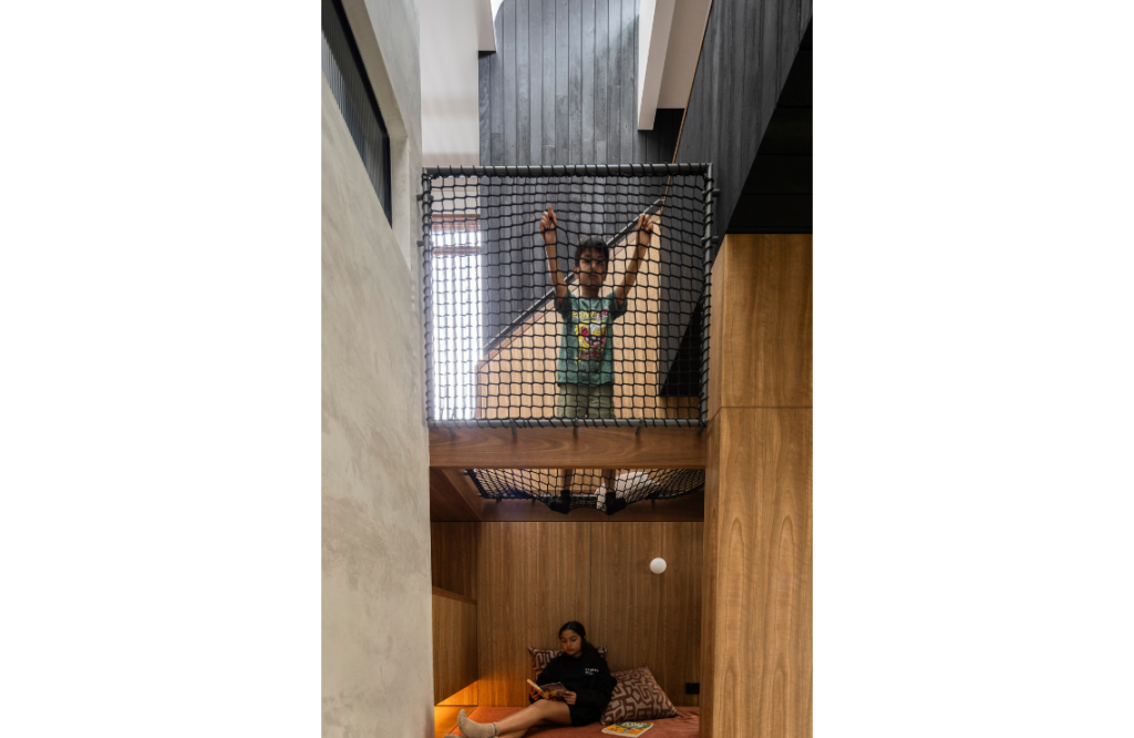 The central stair and void are a standout. “This space seems to flow across the entirety of the home, linking each family member while maintaining privacy,” says Charly. “This was also one of the most detailed elements of the build, but its hidden complexity provides an understated calmness.” Charly says aspects of the build — the central stair, pantry, joinery, nook and mesh hammock — were standouts, with excellent collaboration with Build by Design and Scotts Kitchens. “The entire unit is a mix of solid and veneer panels of spotted gum, with no visible fixings,” she notes. “There is also critical alignments of stair treads and risers to shadow gaps that run on to align with doors, and shelves at a consistent height of 2.4m.”