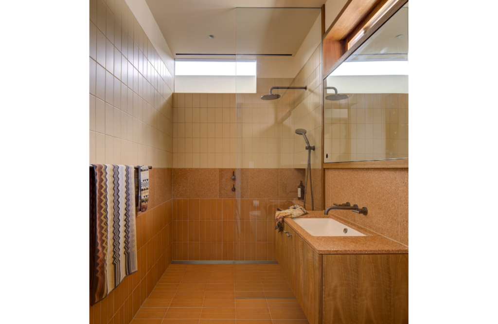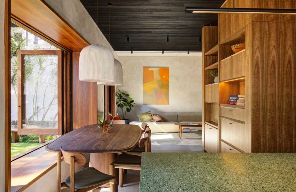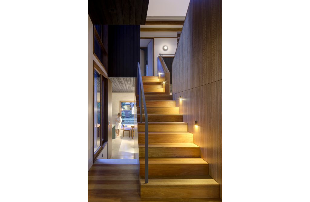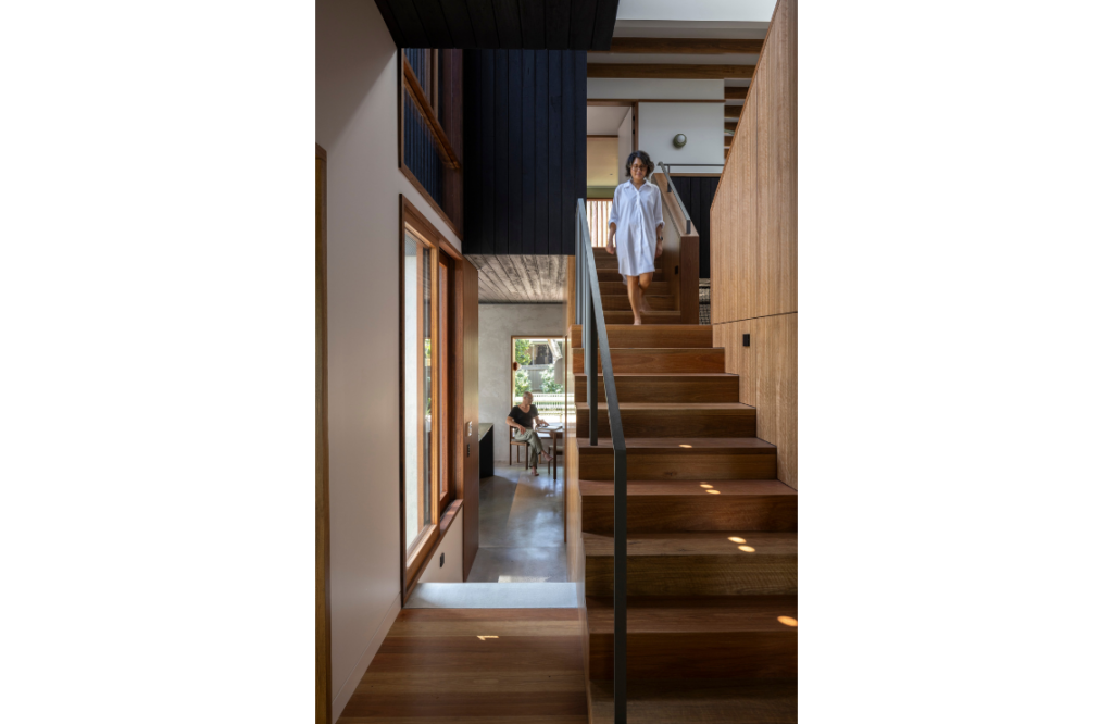The feeling of restfulness and respite from the busy coastal locale is evident as soon as you step over the threshold. The interiors reflect the homeowners’ desire to avoid stark white; instead it’s imbued with natural earthy-based colours and Australian hardwoods. It’s a dwelling that indeed seems to hug the vegetation that surrounds it. Charly says in response to the sloping site, the rear ground floor was lowered to meet the garden, sinking the home into the greenery. “The existing external walls were strategically modified to introduce a central courtyard and provide layered views,” she explains.