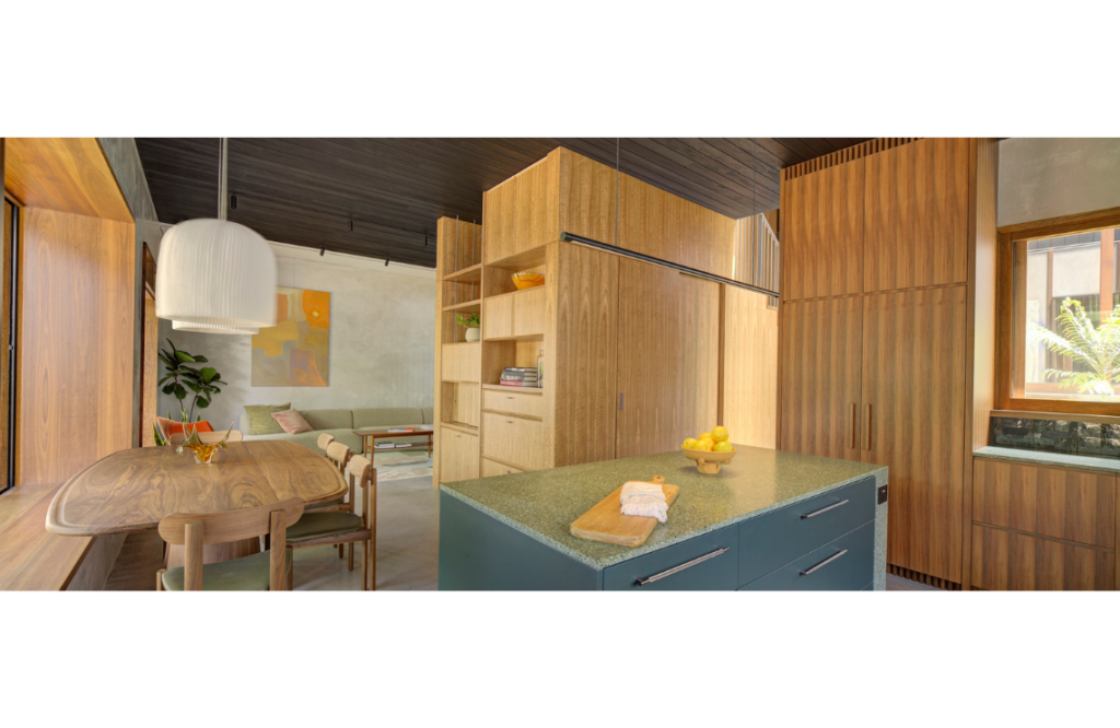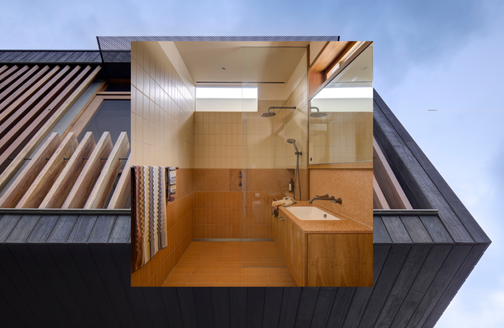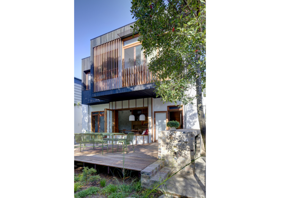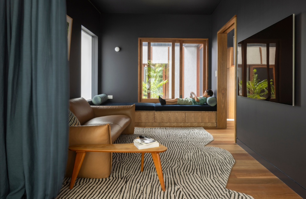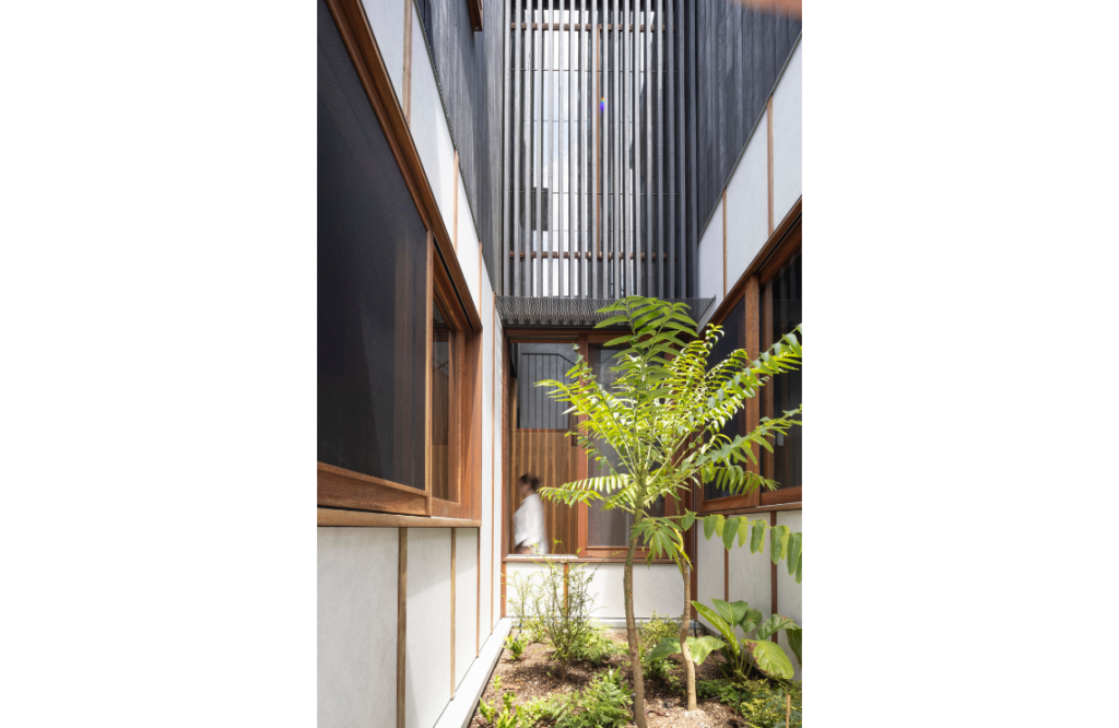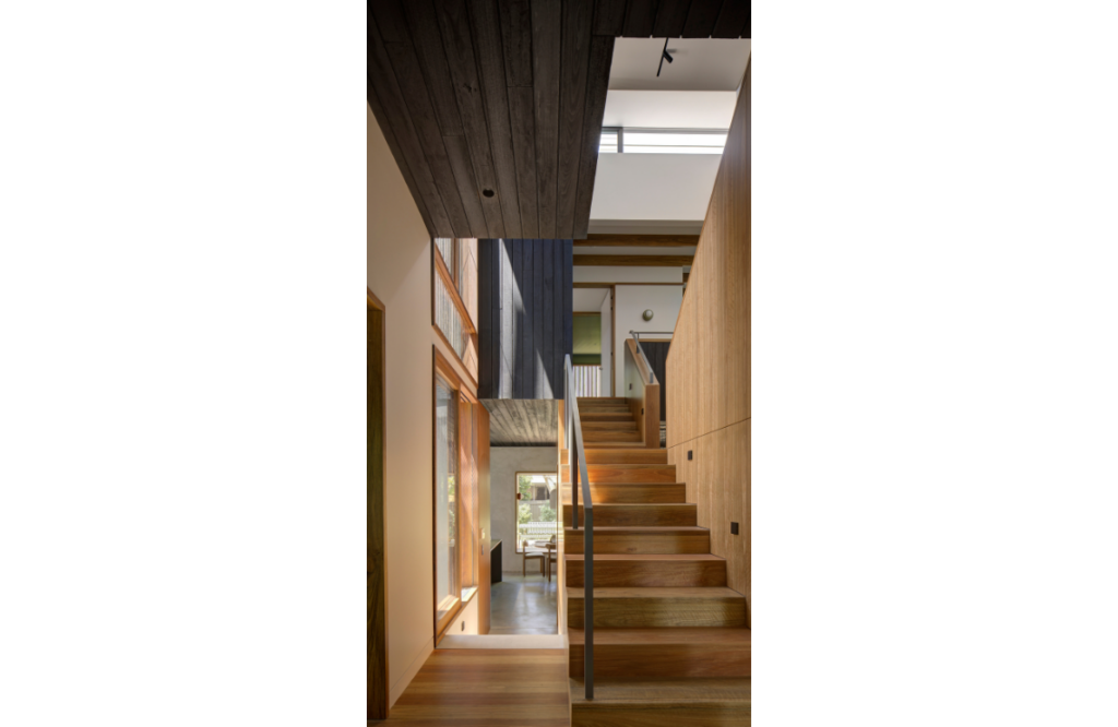Environmental considerations were ably addressed. These include two periscopes in the roofscape that expel warm air and keep the home cool, careful placement of operable and smaller awning windows, and the planted courtyard. Australian hardwoods were used in doors and windows, including spotted gum and grey ironbark. The charred cladding is jarrah.