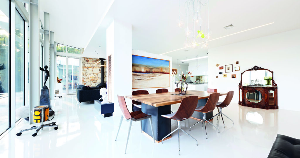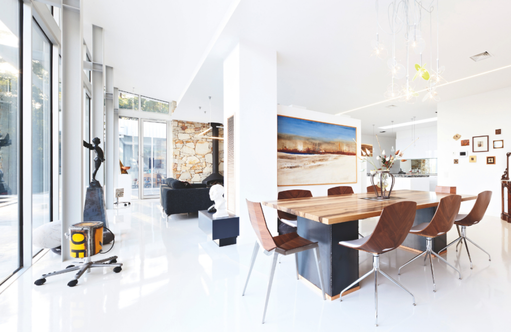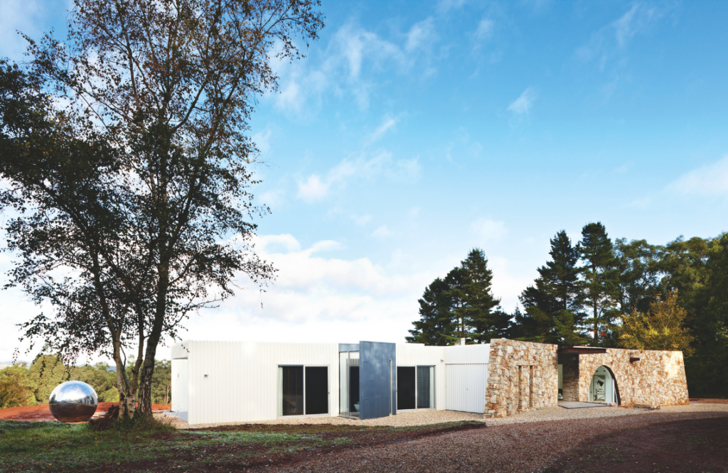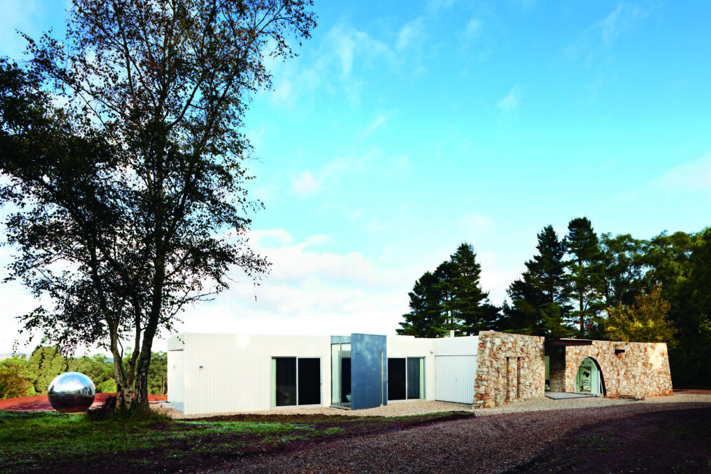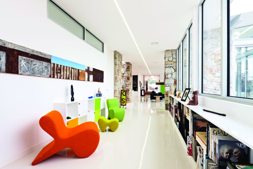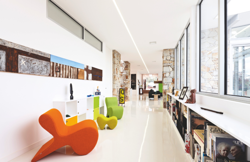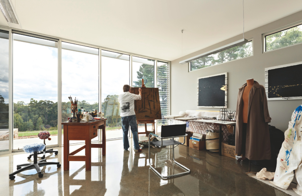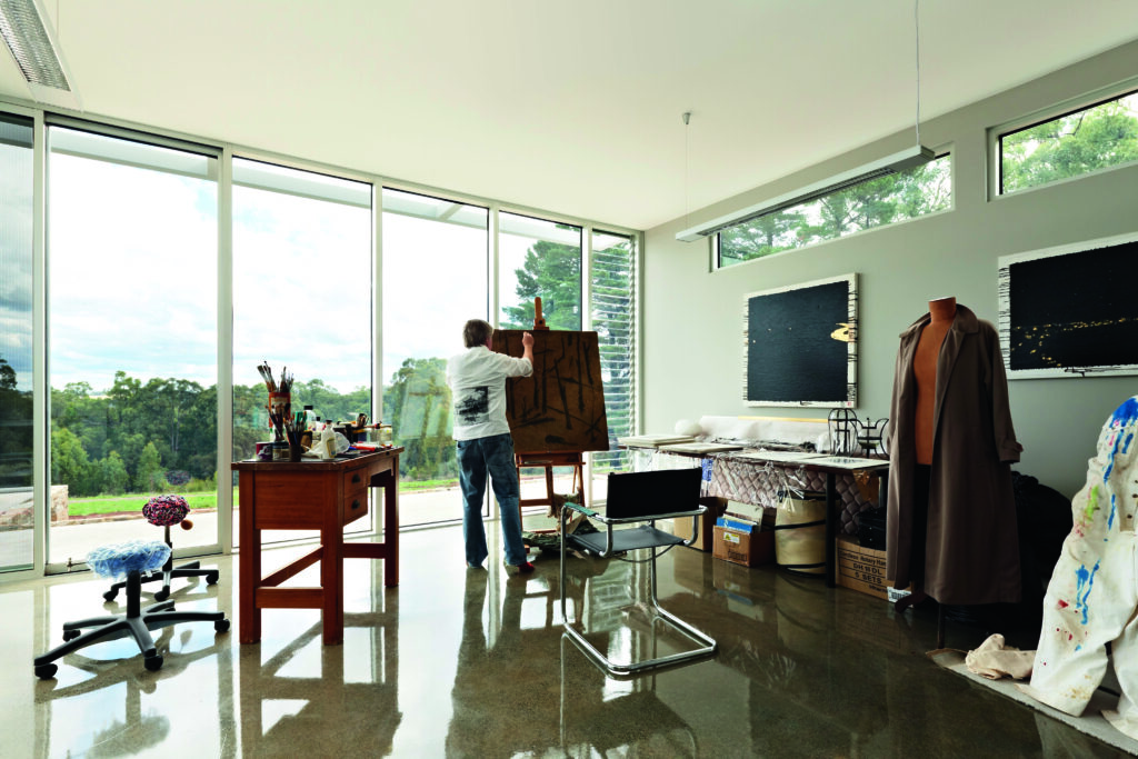 Externally, the mix of ochre-toned stone, white steel, bluestone and glazing along with elements of Corten paint and Corten steel is at ease with the landscape. Internally, floors in the kitchen, dining, living, library, storeroom, powder room and Renee’s studio are white Sika, a resin finish atop the home’s concrete slab. The hardy, stain-resistant product, while often associated with commercial applications, appealed both aesthetically and functionally, says Renee.