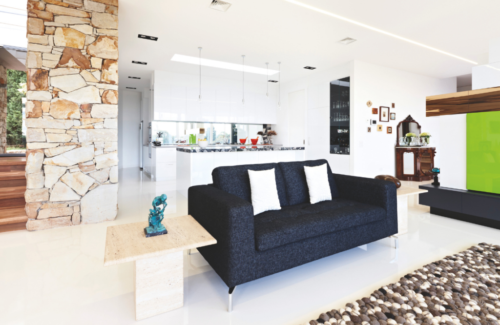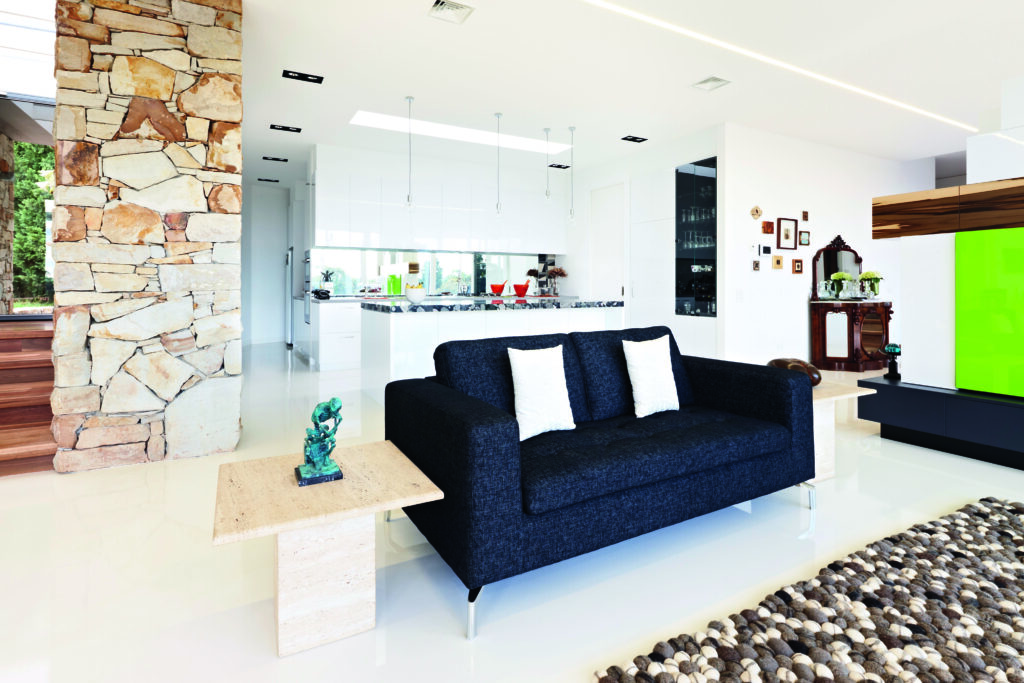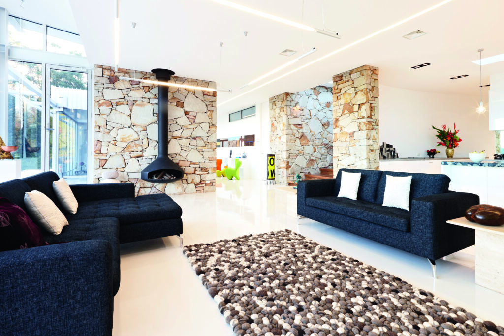 “The home wasn’t going to be McMansion style. It’s simply one long rectangle with a stone wall curved across the front,” Laurie says. “We see it more as a large apartment — it has that feel about it with the kitchen, dining and living all in the one space,” concurs Renee. Ease of cleaning influenced the smart floor plan comprising sleeping quarters at one end, work at the other and living in the middle.