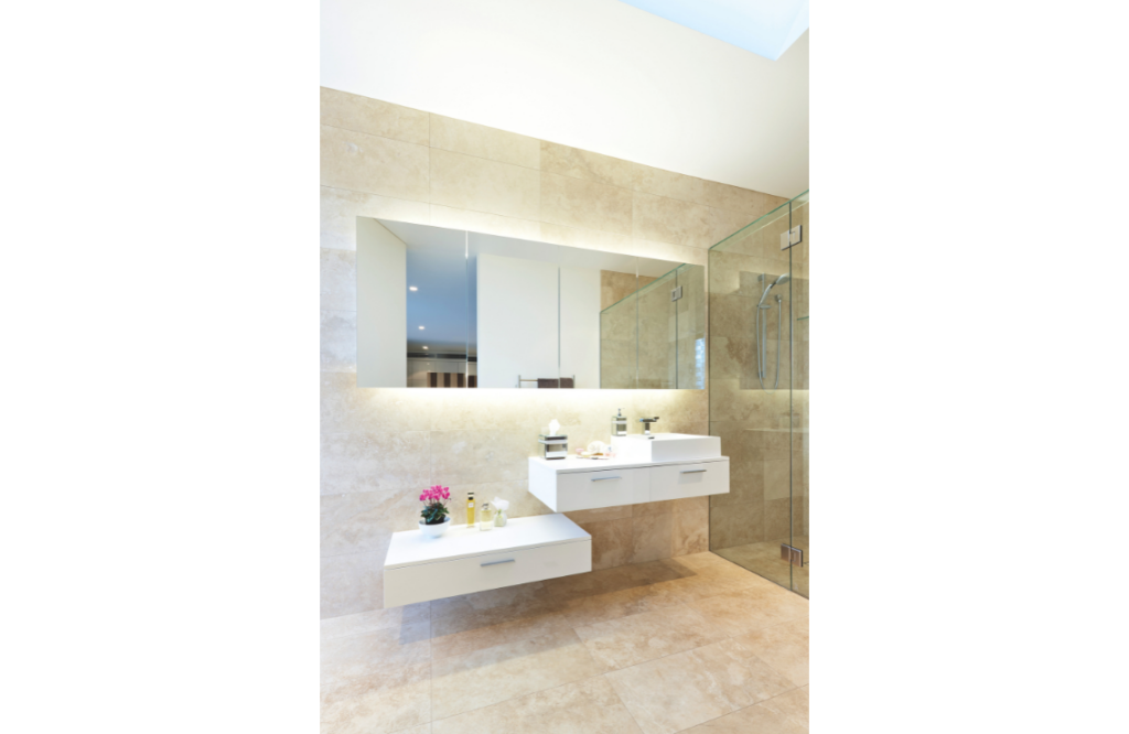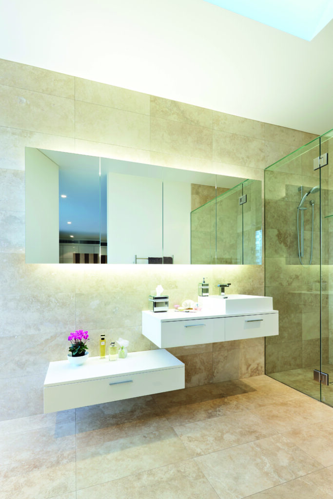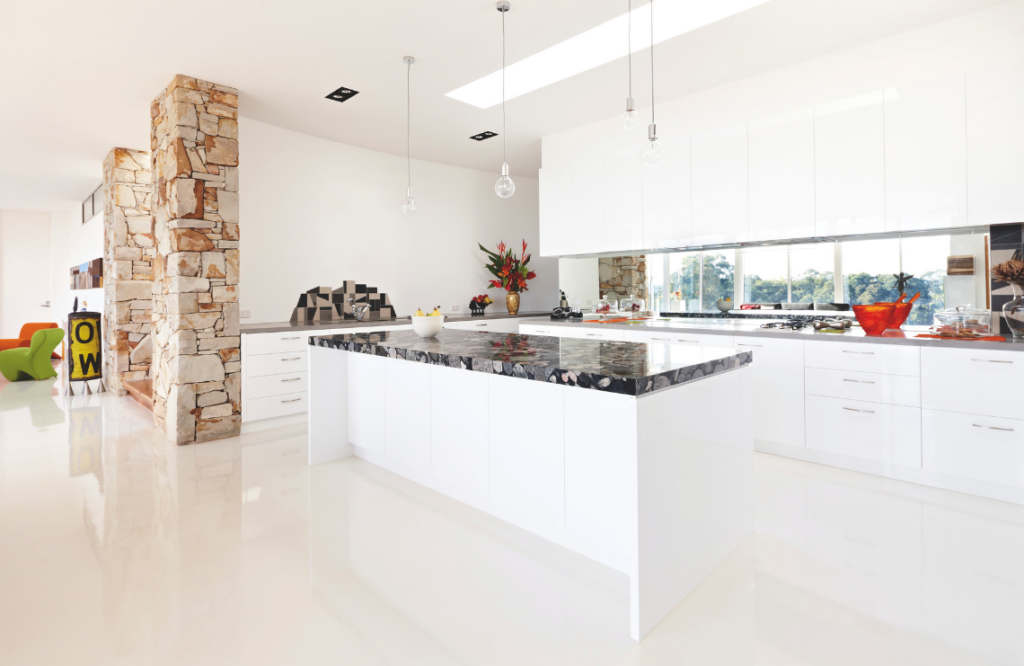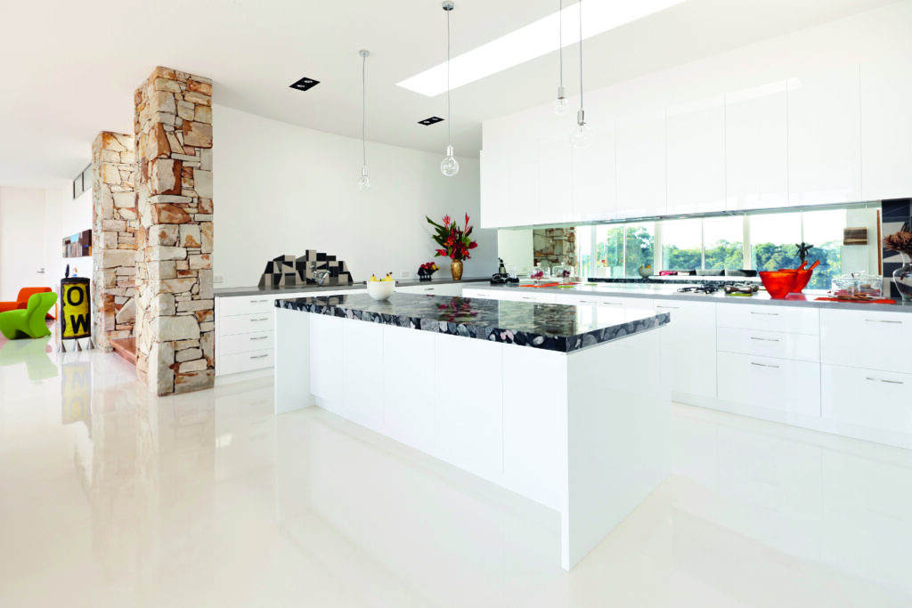 Renee and Laurie were attracted to the strong graphic pattern of South American granite for the island bench in the kitchen, which they say appears to float on top of the two-pack white-painted cabinetry. The choice of mirrored splashback imparts the impression of “the wall disappearing,” says Laurie, and cleverly brings in the reflection of the landscape.
