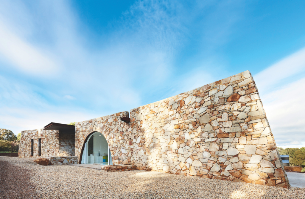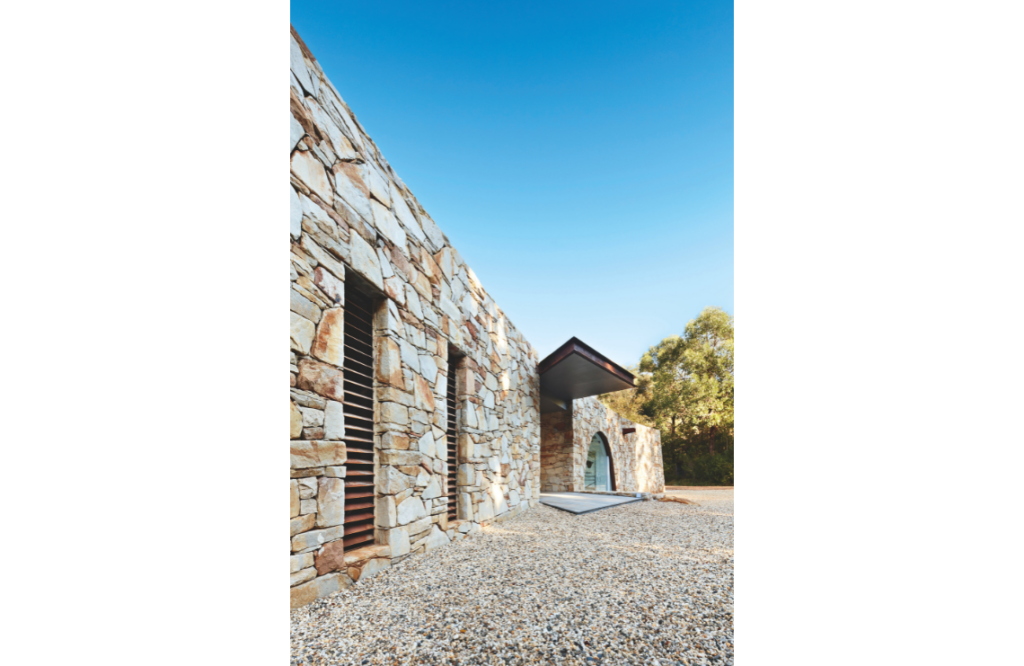Mike introduced the idea of stone for the dramatic front wall as an alternative to their original interest in tilted concrete slabs, an idea foiled by site access. Since it would be a large feature with the tone of the stones ranging from whites, purples through to pinks, Renee and Laurie took the precaution of visiting the quarry in Maffra where they could “almost select the palette that the stonemason was going to work from,” says Laurie. They were keen to avoid the potential for a candy-coloured wall, he adds: “Renee always wanted more white [but] I wanted more ochre, so we got a balance.”